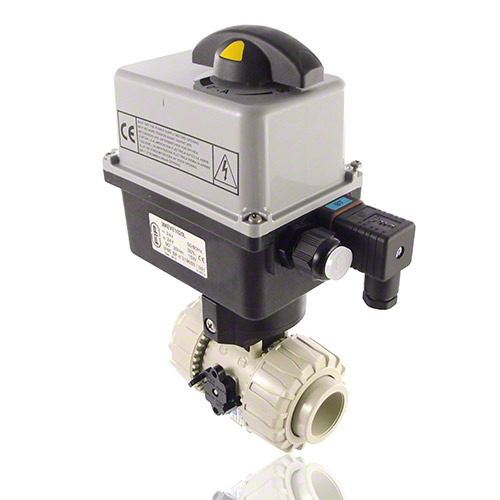 | 2/2-Wege-Kugelhahn mit gesicherten Überwurfmuttern aus PP mit elektrischem Stellantrieb mit Endlagenrückmeldern, Handnotbetätigung und optischer Stellungsanzeige Stellantriebsdaten: Standard 90-240V / 50-60Hz (AC), ohne Aufpreis 24V AC/DC Andere Spannungen auf Anfrage Anschlussart: Schweißmuffe zum Heizelementmuffenschweißen Dichtung: PTFE/FPM |